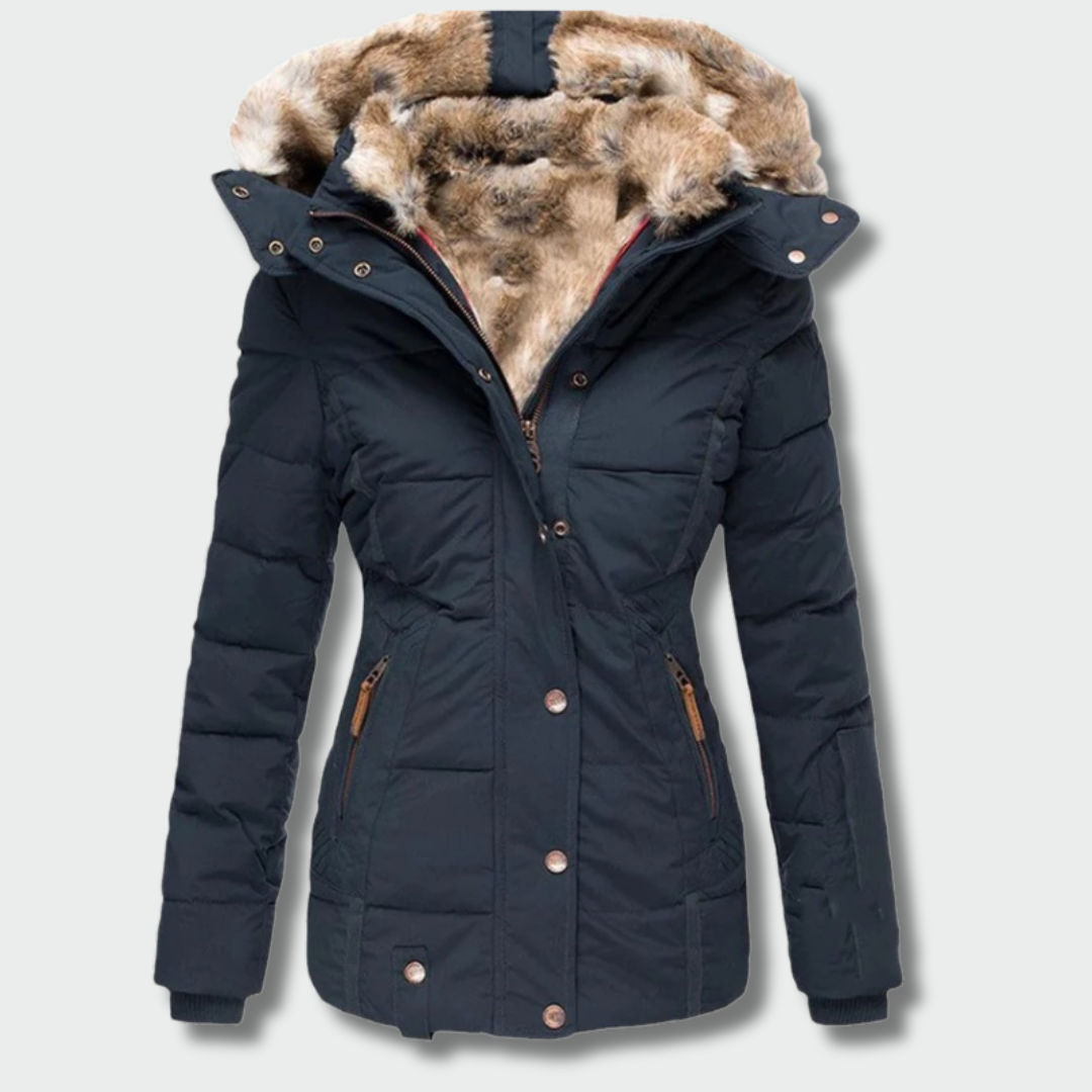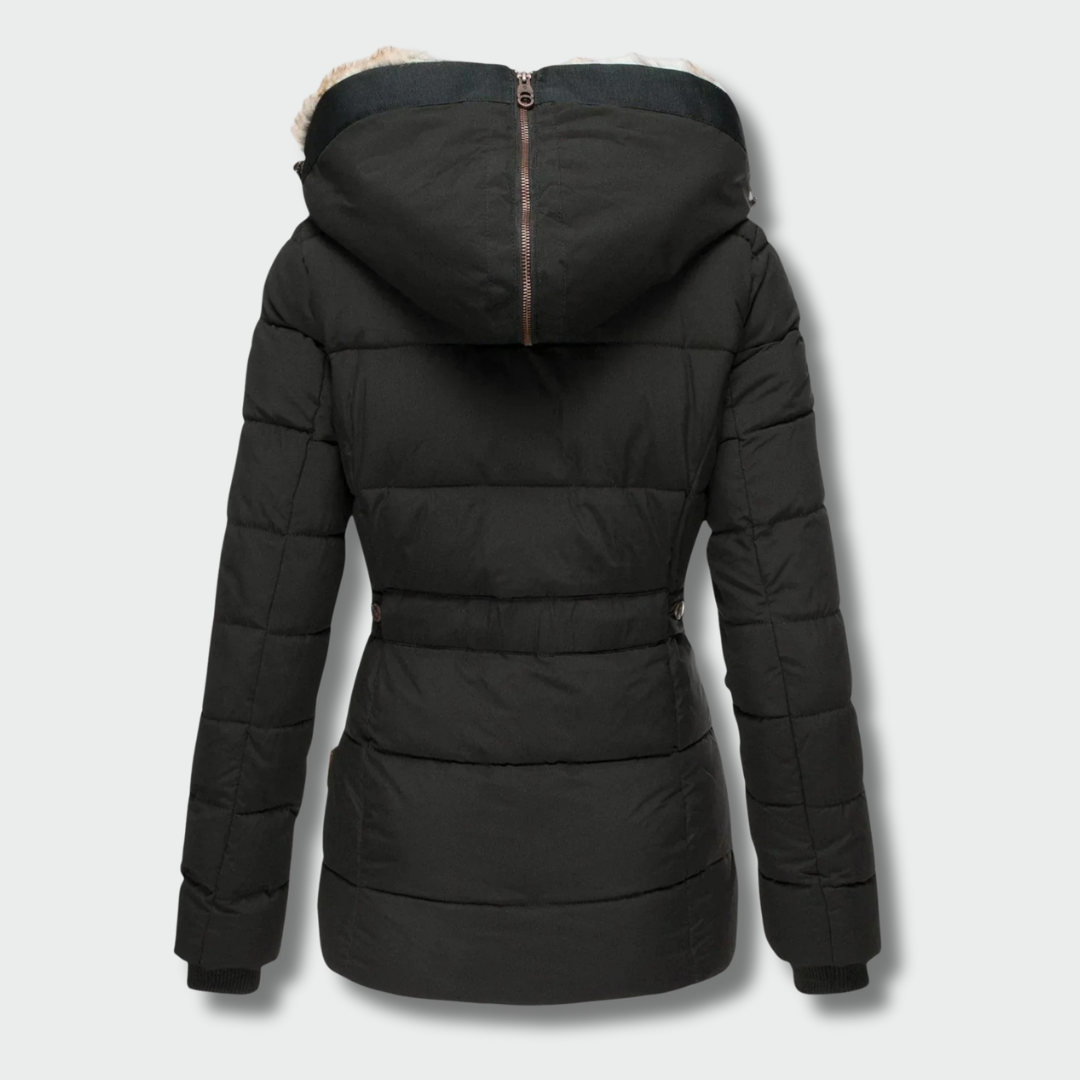 Šis aptakus žiemos paltas pasižymi plona silueto linija ir minkšta izoliacija. Jis apsaugo nuo šalčio, vėjo ir lengvo lietaus, tuo pačiu išlaikydamas moterišką formą ir stilingą įvaizdį.