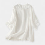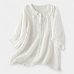 Žaismingi marškiniai iš lengvos medvilnės ir lino mišinio, derinantys eleganciją ir komfortą. Peter Pan tipo apykaklė su volanais suteikia unikalią detalę, kuri pakelia kiekvieną kasdienį įvaizdį, idealiai tinka sijonams ar kelniams.