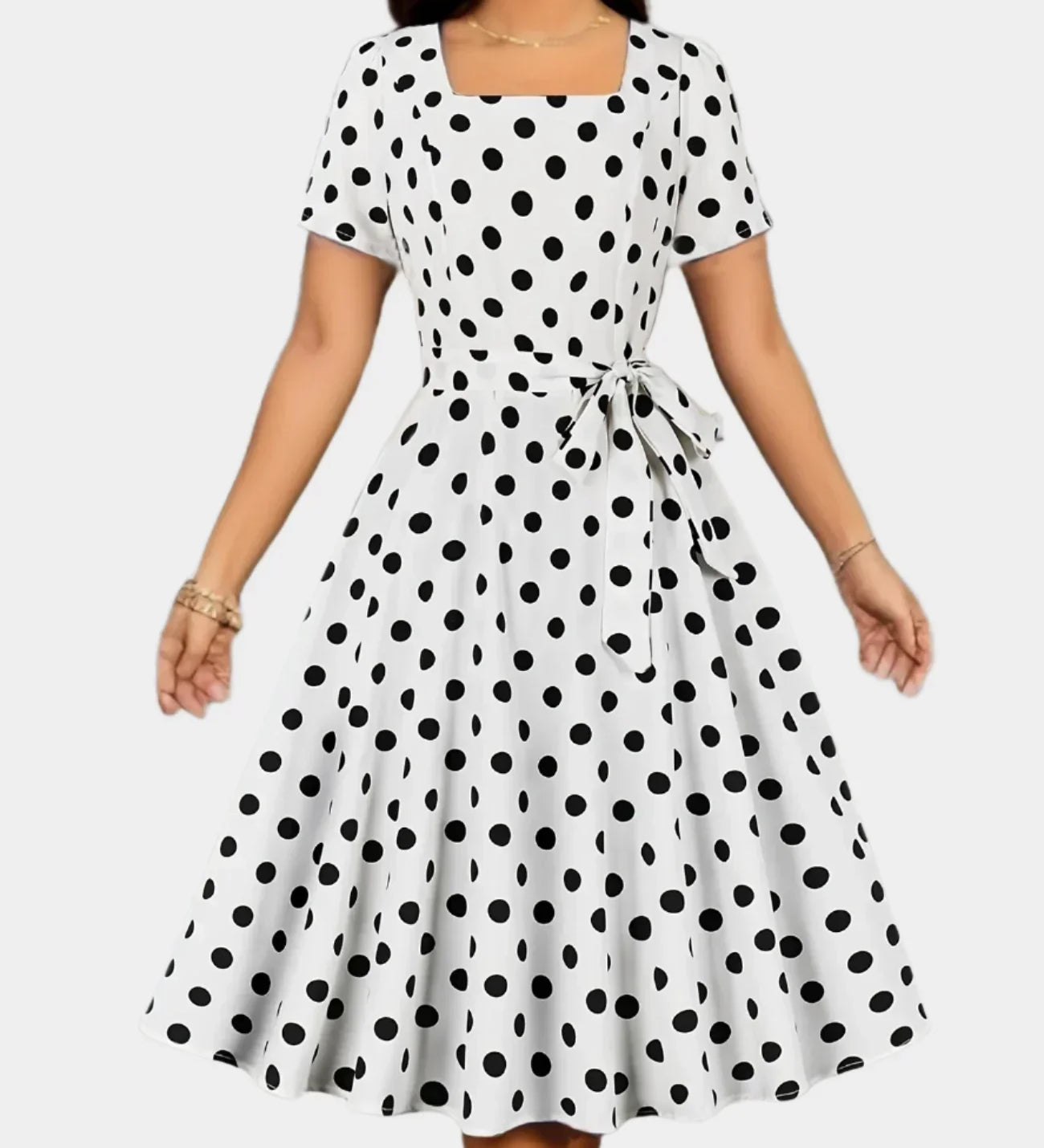 Retro Taškų Suknelė su Diržu ir Kvadratine Iškirpte