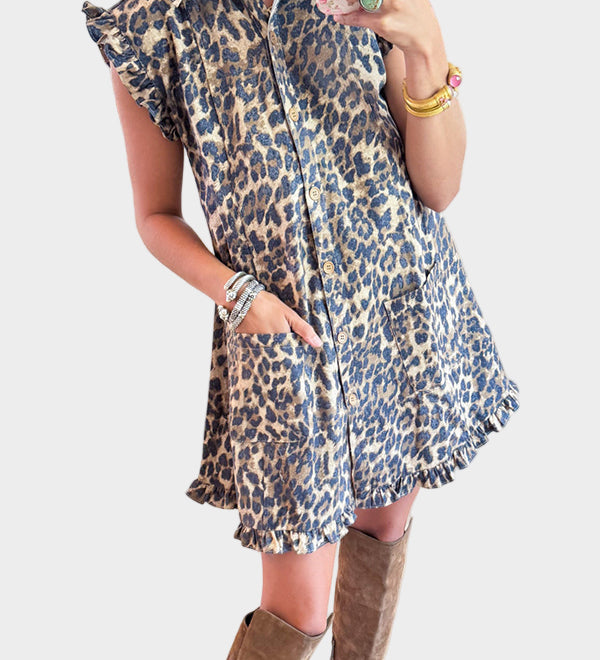 Suknelė su Leopardo Kišene ir Elegantiška Volano Detale