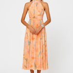 Elegantiška ir lengva suknelė su įspūdingu surišamu kaklu ir romantiška nuotaika. Juostos viduryje pabrėžia siluetą, o orinė sijonas su klostėmis suteikia judesio ir rafinuotumo. Puikiai tinka vestuvėms, vasaros renginiams ar stilingoms vakarėliams.
