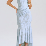 Įspūdinga suknelė su prigludusia linija ir reljefiniu raštu, kuris elegantiškai apgaubia kūną. Išlenkta liemenėlė suteikia atramą ir moterišką liniją, o gerai suprojektuoti klostės juosmens srityje pabrėžia siluetą. Asimetrinė sijonas suteikia judėjimą ir prabangą kiekvienam įvaizdžiui.
