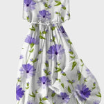 Ši elegantiška maksi suknelė su balta baze ir purpuriniais gėlėmis skleidžia gaivumą ir moteriškumą. Lengvas audinys ir laisvas kirpimas daro ją idealia pasirinkimu pavasario ir vasaros pasirodymams.