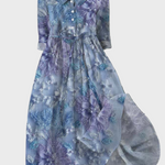 Ši ilga suknelė purpurinės ir mėlynos spalvos atspalviuose derina romantiką ir eleganciją. Jos unikalus gėlių raštas suteikia gaivumo pojūtį, o lengvas siluetas daro ją idealia pavasario ir vasaros pasirodymams.