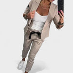 • Stilingas ir patogus derinys – švarkas ir sportinės kelnės sujungia eleganciją su laisvumu, sukuriant modernų ir patogų stilių.