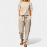 Atnaujink savo vasaros garderobą su šiuo elegantišku ir patogiu dvipusiu komplektu, idealiai tinkančiu karštoms dienoms ir vėsioms vakarams. Jis susideda iš lengvos palaidinės ir plačių kelnių su raišteliu, siūlančių komfortą ir stilių bet kuriai progai.