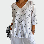 Balta palaidinė su juodomis linijomis ir taškeliais yra puikus paprastumo ir elegancijos derinys. V formos iškirptė suteikia moteriškumo, o patogus audinys ją daro idealia kasdieniam naudojimui, taip pat ir elegantiškesnėms progoms.