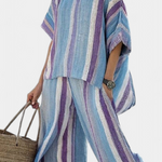 Gyva gaiva su spalvų švelnumu. Daisy komplektas sudaro laisvas palaidinės ir plačių kojų kelnių derinys su vertikaliomis juostelėmis, įkvėptomis Viduržemio jūros. Švelnios jo atspalvių ir lengva tekstūra sukuria džiaugsmingą, patogią ir judančią išvaizdą.